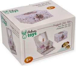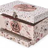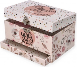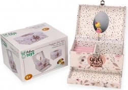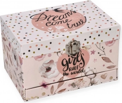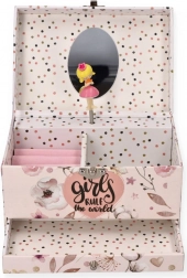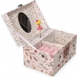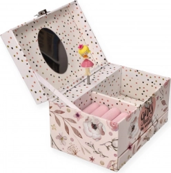 Dette sarte lyserøde smykkeskrin med blomster- og prikket motiv gemmer alt det, små piger elsker: Når låget åbnes, spiller en melodi, og ballerinaen begynder at dreje på sin aksel foran det ovale spejl. Indeni finder du en praktisk inddelt plads med ringpuder og rum til små skatte.