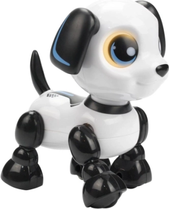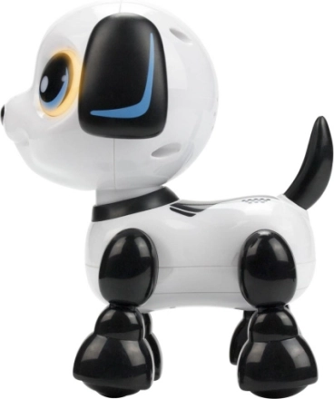 Sødt interaktivt robot-hvalp, der går, bevæger hovedet, har LED-øjne og laver lydeffekter. Sjov underholdning for børn fra 3 år, udvikler fantasi og finmotorik.