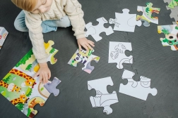 På bagsiden af puslespillet findes en malebog med spændende motiver, som børn kan farvelægge og dermed udvikle deres kreativitet.