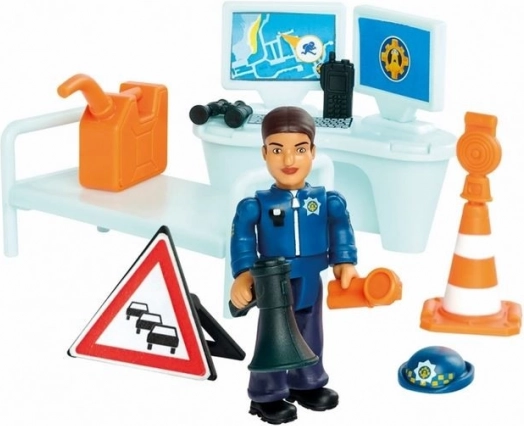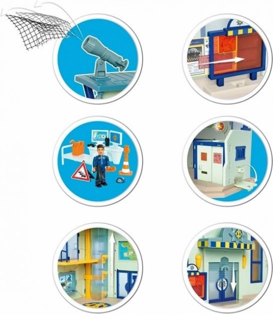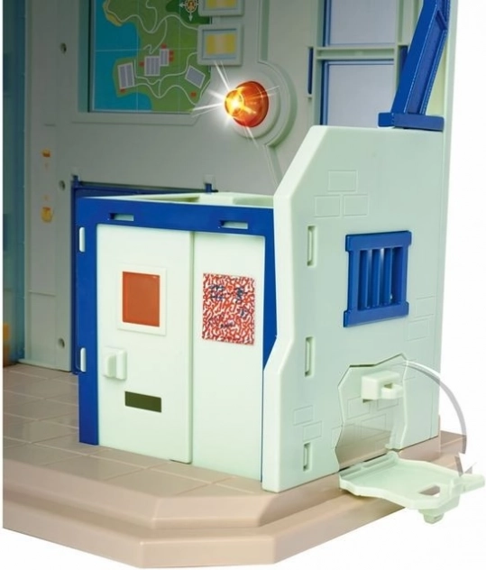 Polititilflugtsstedet fra den nyeste udgave af Brandmand Sam garanterer masser af lege-muligheder: der er parkeringsplads til en jeep, et fængsel med gennembrydelig væg, elevator, alarm, helikopterlandingsplads, stue- og førstesalsrum er møbleret.