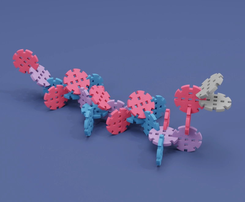 Mini konstruktionshjul er et innovativt byggesæt, der kombinerer leg og læring. Den særlige form med tappe gør det muligt at skabe bevægelige mekanismer, gear og originale 3D-konstruktioner. Børn træner naturligt finmotorik, logisk tænkning og rumlig forestillingsevne – alt sammen sikkert takket være det bløde og fleksible materiale.