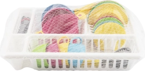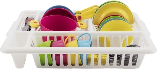 Dette børnesæt med service og opvaskestativ indeholder alt, hvad små kokke behøver til at lege madlavning og borddækning. Det lette, sikre plastikservice i strålende farver inspirerer til at efterligne rigtige køkkenaktiviteter og udvikler fantasien.