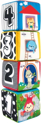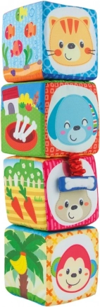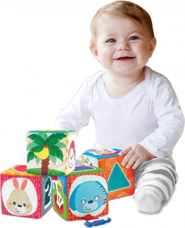 Opdag et sæt med 4 farverige tekstilterninger til babyer og småbørn, som udvikler sansemæssig perception, finmotorik og læring af tal og former. Hver terning har forskellige teksturer, et sikkert spejl og illustrationer af dyr, tal og former. Terningerne kan stables til en stabil pyramide og bruges til at lave billedserier for sjov læring.