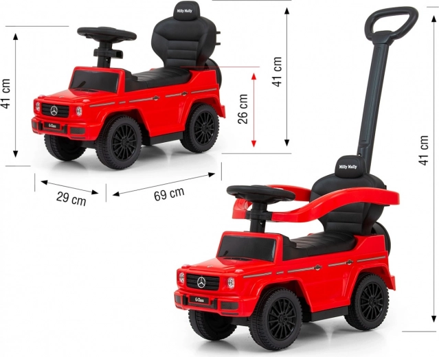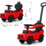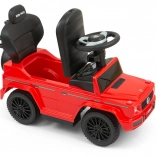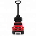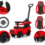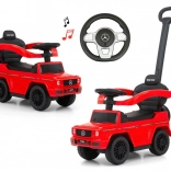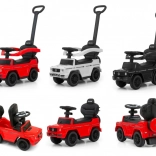Køretøjet MERCEDES G350d, licenseret af Mercedes, er fremstillet med stor fokus på selv de mindste detaljer og kvaliteten af de anvendte materialer. Takket være legetøjets multifunktionelle karakter går dit barn ikke hurtigt træt af det og udvikler gennem legen sine manuelle færdigheder og motoriske evner. En yderligere fordel er det interaktive rat, som gør legen endnu sjovere. Produktet har styrehjul med rat eller skubbestang, hvilket sikrer behagelig kørsel under gåture. Det er meget let at montere og afmontere, er stabilt og sikkert. De enkelte elementer (gelænder og håndtag) kan afmonteres, så køretøjet “vokser” med dit barn.
