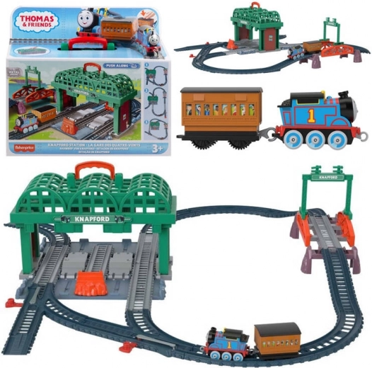 - Knapford Station med opbevaringspanel og håndtag, skinnedele, bro, overkørselsskiltning, lokomotivet Thomas (push‑along), personvogn med passagerer