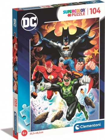 Børnepuslespil CLEMENTONI DC Comics SuperColor, 104 brikker. Livlige farver, tryk af høj kvalitet, mål 33,5 × 48,5 cm. Udvikler motorik og koncentration.