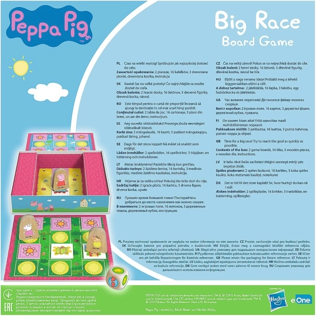 Big Race (Det store løb) er et muntert og enkelt brætspil med Gurli Gris-licens, hvor børn oplever deres første sejre og nederlag. Kast den store træterning, flyt dine træfigurer rundt på den farverige spilleplade, og vend kort med særlige handlinger – ekstra kast, byt figur, et skridt frem eller tilbage. Målet er klart: Vær den første, der forlader spillepladen, og vind det store løb!
