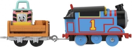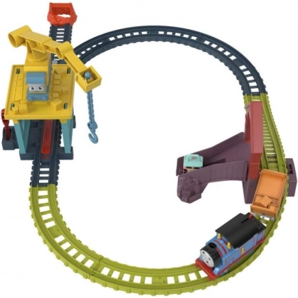 Dette farverige batteridrevne sæt med 18 dele giver børn actionfyldt lastning og losning med kranen, kørsel på en rund bane og sjov nedkørsel af vognen Sandy på rutsjebanen. Den motoriserede Thomas trækker en godsvogn, mens kranen Carlys drejelige bom med krog nemt griber og flytter lasten.