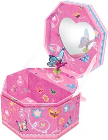Denne elegante ottekantede musiksmykkeæske med sommerfuglemotiv er det ideelle sted at opbevare ringe, øreringe og andre små skatte. Når den åbnes, lyder en behagelig klassisk melodi, og indeni danser figuren, hvilket skaber en magisk stemning.