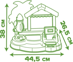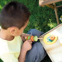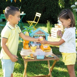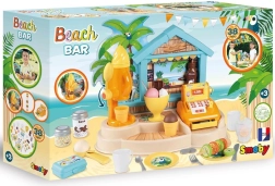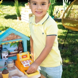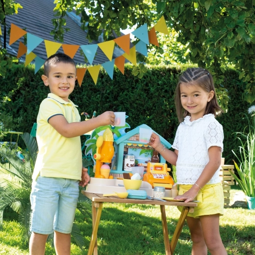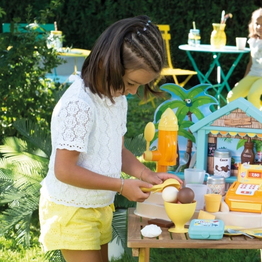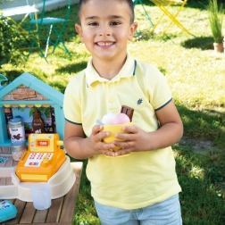 SMOBY strandbar er en kreativ bod til rolleleg som sælger og kunde. Børn kan prøve at lave isdessert i bæger, smoothies og frugtspyd, pynte med saucer og drys og registrere køb på et funktionelt kasseapparat. Realistiske detaljer styrker fantasi, sociale færdigheder og finmotorik.
