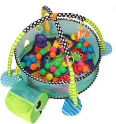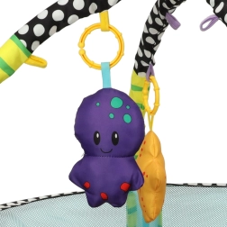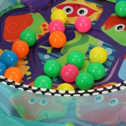- Legetøj og bolde: Tæppet indeholder farverige og bløde legetøj som en fisk, en blæksprutte, en stjerne og en lille æske med spejl. Derudover stimulerer 30 plastbolde i livlige farver barnets sanser.