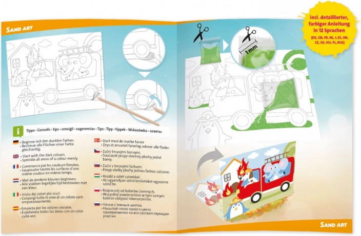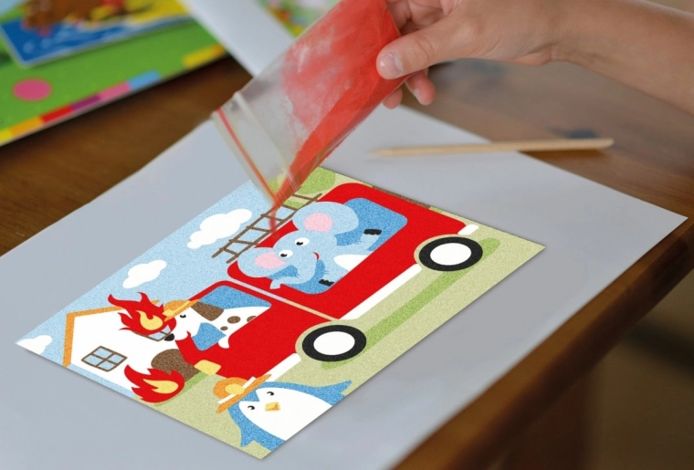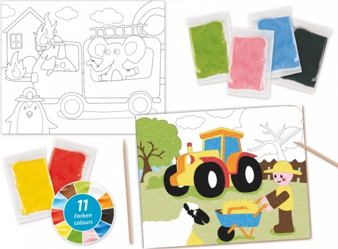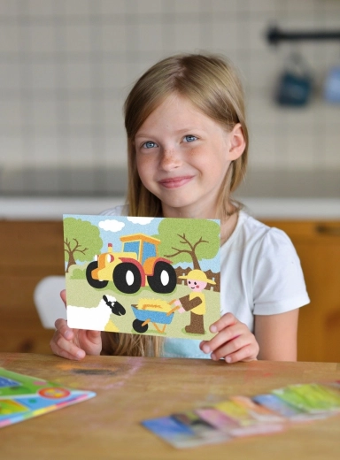 Dette kreative sand-sæt er et godt valg til små skabere fra 6 år. De enkelte dele af motivet afdækkes trin for trin og drysses med farvet sand – farverne hæfter på den selvklæbende overflade og skaber et klart, rent billede. Sættet byder på to populære motiver: en traktor og en brandbil.