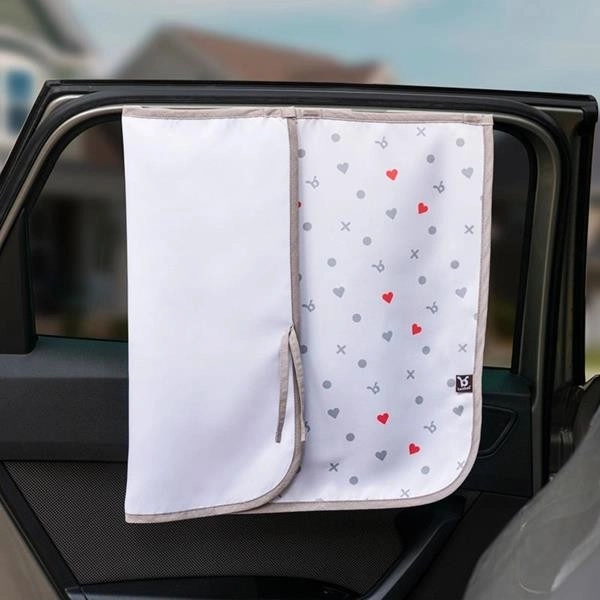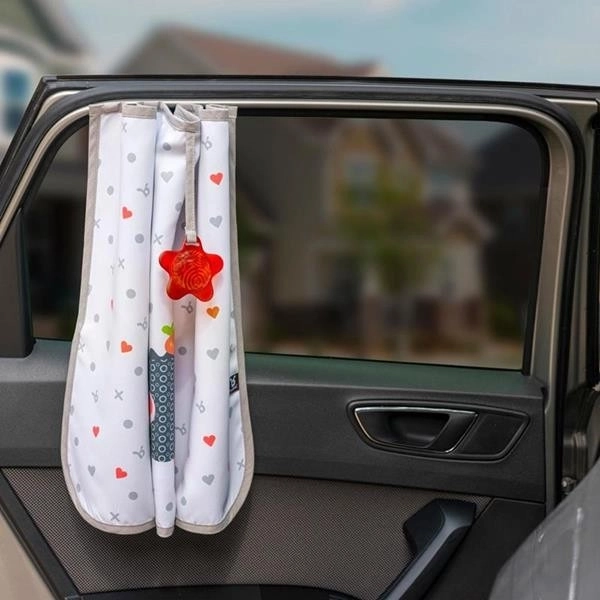 Installationen er meget enkel takket være de fire stærke magneter, som hurtigt og sikkert fastgør skærmen til dørens metalramme uden brug af sugekopper eller kroge. Når du ikke længere har brug for skærmen, kan den nemt foldes og bindes sammen med de indsyede stropper for nem opbevaring. Den særlige stjerne med glitrende effekt giver desuden underholdning til de små passagerer, så turen føles kortere.