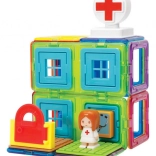Magformers By: Hospital er en del af en serie, der gør det muligt for små byggere at skabe deres egne byer og lokalsamfund efter fantasien. Sættet indeholder 22 dele – 8 firkanter, 4 rektangler, 9 plasttilbehør og 1 figur. Velegnet til at kombinere med andre sæt i By-serien.