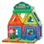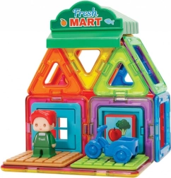 Med byggesættet Magformers Byen Markedsplads kan du bygge forskellige arkitektoniske konstruktioner efter egen fantasi. Det indeholder 14 magnetiske former og 8 funktionelle tilbehør, inklusive en lille butikssælger, som gør det muligt at skabe delvist åbne snit, hvor man fra den ene side ser bygningens ydre konturer og fra den anden interiørløsningen.