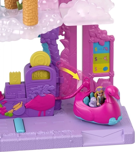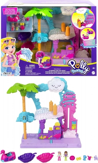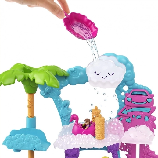 Ved “fartbumpet” dukker elementer fra benzinstationen op med en flamigoslange – klar, tank op, og så afsted igen! I bilen kan der køre både en dukke og en dyreven (tukan eller dovendyr). Sættet er kompatibelt med de fleste POLLY POCKET-køretøjer og giver timevis af fantasifuld leg med vandeffekter.