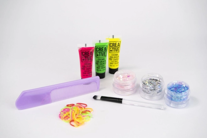 Giv frisurer nyt liv med et kreativt sæt til små stylister! Indeholder 3 farvede geler, 3 glitrende drys, elastikker, pensel og kam for nem påføring og skabelse af unikke looks.