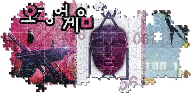 Panoramapuslespil CLEMENTONI Netflix Squid Game med 1000 brikker. Kvalitetsprint, holdbart karton og mål efter samling 98 × 33 cm. En fantastisk gave til fans.