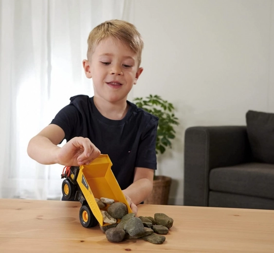 Licenseret VOLVO tipbil uden motor med lys- og lydfunktion. Kabinen er lavet af metal. Bløde gummidæk klarer nemt det krævende underlag på byggepladsen. Bevægelige dele: motorhjelm og tiplad. Længde: 20 cm.