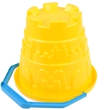 Den plastiske spand med blå hank og forme indeni gør det nemt at tage med på stranden eller i haven.