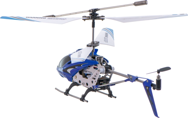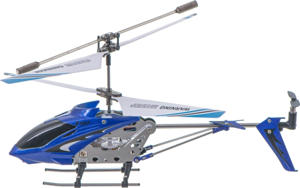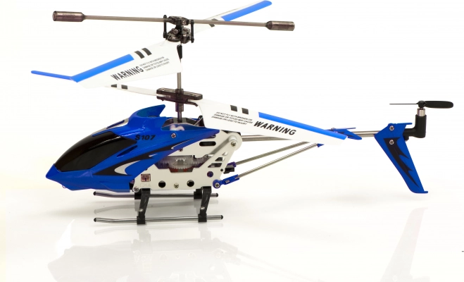 Let og robust RC-helikopter SYMA S107G med metalramme er ideel til indendørs flyvning. Stabil styring sikres af gyroskop GYRO og et par modroterende rotorer (co-axial). Den tilbyder 3,5-kanals styring, rækkevidde op til 15 m og flyvetid 7–10 minutter på en enkelt opladning.