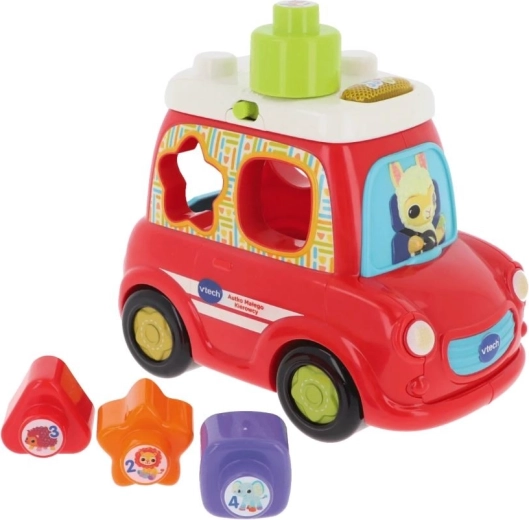 Bilens side fungerer som en formsorter, og i pakken finder du 4 farverige klodser i forskellige former, som hjælper med at udvikle finmotorik, logik og hånd–øje-koordination. Legetøjet er egnet til børn fra 6 til 36 måneder, og takket være det medfølgende testbatteri AA er det klar til brug med det samme.