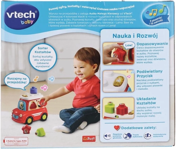 Den interaktive VTech-bil er en fantastisk måde at udvikle børns færdigheder gennem leg. Den taler på polsk, lærer former, tal og dyrenavne samt deres lyde, og takket være lys- og lydeffekter fastholder den børns opmærksomhed. Fire drejelige plastikhjul sikrer en jævn bevægelse under legen.