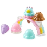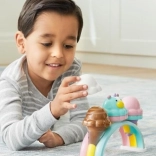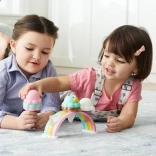 Sættet rummer alt til en lille isbutik derhjemme: 5 farvede kugler, en særlig enhjørninge-kugle, 3 kræmmerhuse og et regnbuestativ til servering. Ideelt til både selvstændig leg og fælles leg med søskende eller venner.