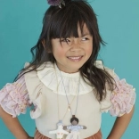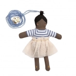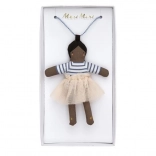 Halskæden er lavet af en fint forarbejdet dukke navngivet Ruby og en blå kæde med perler. Dukken Ruby er af bomuld og har en smuk skørt af ferskenfarvet tyl.