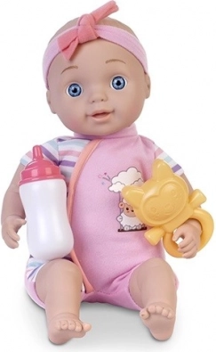 Sød babydukke 33 cm glæder hvert barn med realistiske lyde og rigt tilbehør. Når man trykker på maven, siger den “mor”, “far”, græder og griner. Medfølger flaske, bidering, krammedyr og æsker med detaljerede relieffer. Dukken har blødt pyjamas og hårbånd med sløjfe – perfekt til rolleleg og omsorg.