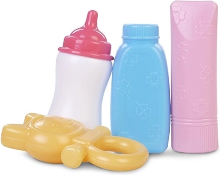 - Rigt tilbehør: flaske, bidering, krammedyr og æsker med relieffer.