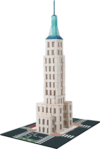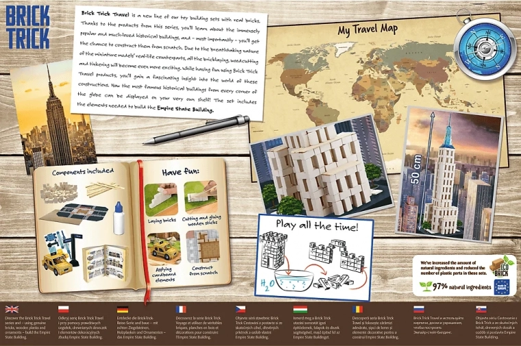 Oplev byggens verden med serien BRICK TRICK Travel og skab din egen model af en af verdens mest berømte bygninger – EMPIRE STATE BUILDING. Sten for sten, med udskæring og limning af lister, når du trin for trin frem til en detaljeret og stabil konstruktion. Til sidst finpudser du den med de medfølgende dekorationer for et autentisk udseende.