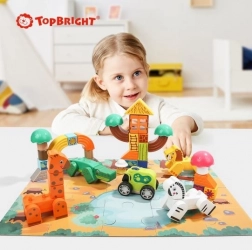 Farverige træklodser gør det muligt at samle en terrængående bil, bygninger og søde dyr. Detaljer som blomster og en bue giver legen en unik charme.