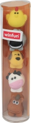 Sættet indeholder en hund, en ko, en kylling, en hest og et får. Børn lærer dyrenes navne og lyde, udvider deres ordforråd og fantasi gennem kreativ fortælling.