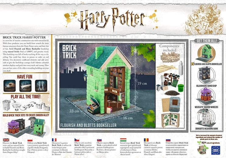 Sættet er designet med omtanke for naturen: det indeholder op til 95 % naturlige materialer og færre plastdele. Byg fra fundamentet til den stilfulde facade, tilføj mos, småsten og skilt, og giv udstillingen på hylden en unik karakter. Kombineres perfekt med andre sæt i BRICK TRICK HARRY POTTER-serien for at skabe hele Diagonalstræde og omgivelserne ved Hogwarts.