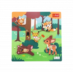 Det træpuslespil med farverig grafik af skovdyr er designet til både at underholde og udvikle barnets færdigheder. Hver brik er robust, let at gribe og udstyret med en træknop for nem udtagning. Bundpladen har udfræsede former med sort-hvidt billede, der matcher brikken, hvilket hjælper barnet med intuitiv sammenpasning.