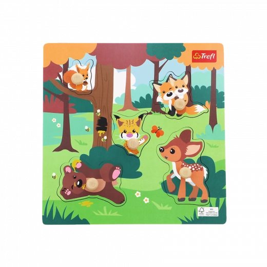 Opdag et kvalitets træpuslespil med motiv af skovdyr til de mindste. Det indeholder 5 udtagelige brikker med træknop og en bundplade med markerede former for nem lægning. Legetøjet understøtter finmotorik, lære former og hånd–øje-koordination. Ideelt valg til børn fra 18 måneder.