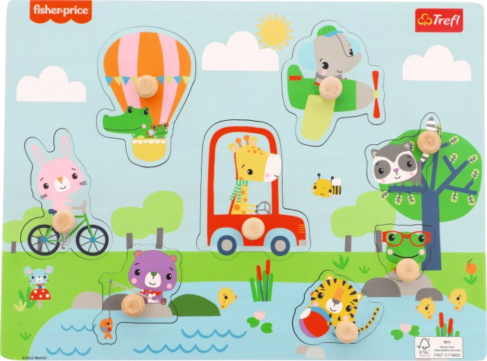 Et sødt træindsætningspuslespil med Fisher-Price-licens, der kombinerer leg og læring. 8 farverige brikker med træknopper er nemme at holde om, og pladen med udfræsede former og sort-hvide ledetråde hjælper med placeringen. Perfekt til finmotorik, koordination og formgenkendelse fra 18 måneder.