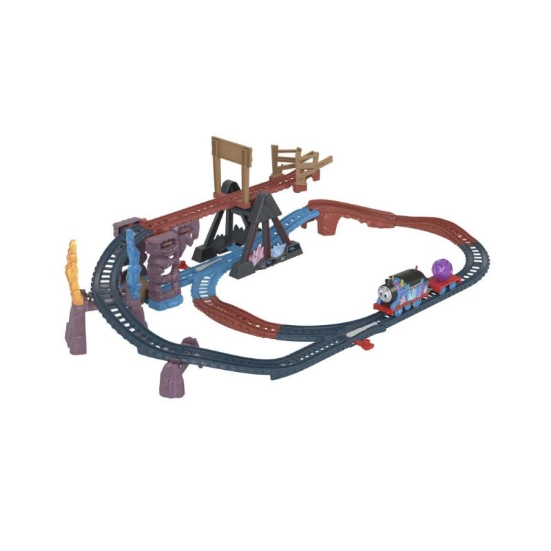 Tag på krystal-eventyr med Thomas! Dette actionfyldte togbane-sæt byder på en flerniveaus bane med faldbro, kryds og tematiske “krystal”-elementer. Med et enkelt skift på toppen af Thomas-toget kører han afsted på skinnerne og leverer lasten til hulen.