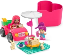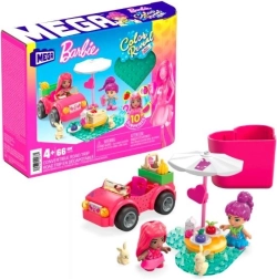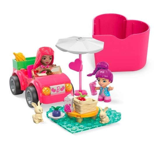 MEGA Barbie Color Reveal byggesættet bringer sjov fyldt med hemmeligheder og fantasi. Hver mikrodukke har et skjult look, der venter på at blive afsløret, og derudover glæder sættet med duftende overraskelser. Byg en stilfuld lyserød cabriolet, sæt dukkerne indeni, og nyd en magisk picnic med to søde kaniner.