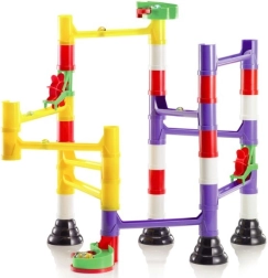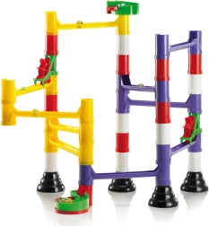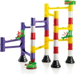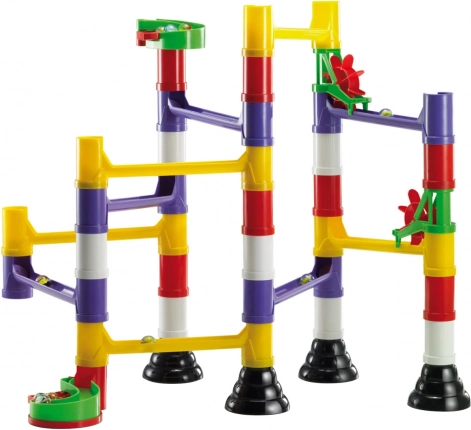Modulære rør, søjler og skinner passer præcist sammen. Børn forstår hurtigt bygge-logikken og kan hele tiden ændre kuglernes rute.