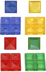 - 1 spilleplade med gitter, 4 sæt á 21 brikker (gul, rød, blå, grøn)