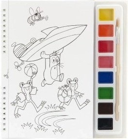Sjovt sæt til små kunstnere: malebog MULDVARPEN OG HELIKOPTEREN med vandfarver og pensel med naturhår. Understøtter udvikling af finmotorik, korrekt greb om penslen og farveopfattelse. De enkelte ark kan nemt tages ud og farvelægges behageligt.