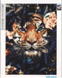 Skab et smukt billede af en Tiger i blomster med diamantglans. Billedet er et kreativt projekt med klare instruktioner og farvekoder for nem afslutning.