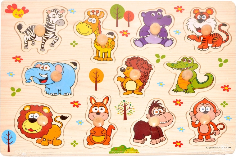 Opdag et sjovt og lærerigt træpuslespil med dyremotiver i størrelsen 22 × 30 cm, som støtter finmotorik, logisk tænkning og genkendelse af former hos børn.