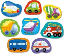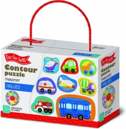 Oplev verden af transportmidler med konturpuzzle, designet specielt til små børn. Hvert af de 8 billeder består kun af to solide brikker, hvilket gør de første skridt i puslespil lettere og styrker de små spilleres selvtillid. Med kontrastfyldte former og klare motiver forstår børn hurtigt princippet om at matche.