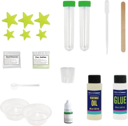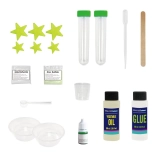 - 2 reagensglas, materialer og redskaber til slimfremstilling, lysende pulver, aktivator, 6 fluorescerende stjerner, vejledning