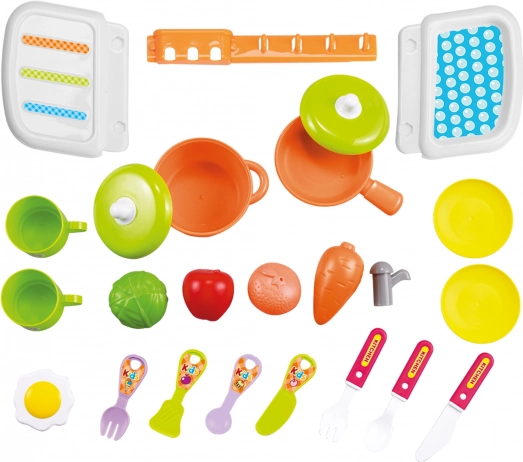 Der medfølger et rigt udvalg af tilbehør, der efterligner rigtige køkkenredskaber. Børn kan “lave mad”, servere og rydde op, hvilket støtter selvstændighed og kreativ tænkning.