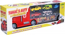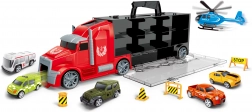 Sættet indeholder 5 små biler og 1 helikopter, så legen kan begynde med det samme efter udpakning. Det praktiske udtrækkelige håndtag på trailerens overside gør det nemt at bære. Leveres med tjekkisk emballage.