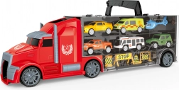 Denne detaljerede lastbil med små biler og helikopter (længde 42 cm) er det ideelle legetøj til små trafikentusiaster. Bilerne kan køre gennem kabinen, traileren med opbevaringsrum på begge sider gør lastning og losning lettere, og friløbshjul sikrer jævn kørsel.